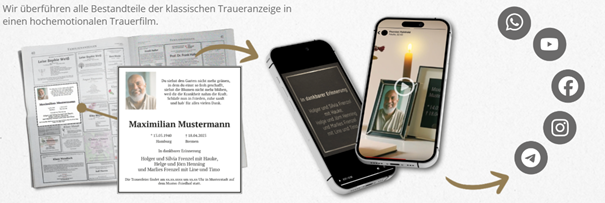Nicht alle Angehörigen erhalten die Tageszeitung, in der die Traueranzeige abgedruckt ist. Mit dieser sehr persönlichen und emotionalen Videoanzeige können alle Kontakte via Social Media und Messenger-Dienste über das Ableben eines geliebten Menschen informiert werden. Das Video wurde speziell für soziale Netzwerke entwickelt. Es kann im WhatsApp-Status, in WhatsApp-Gruppen, Instagram-Stories und vielem mehr geteilt werden. Ihre Kunden haben zudem eine schöne, individuelle Erinnerung an einen besonderen Menschen.